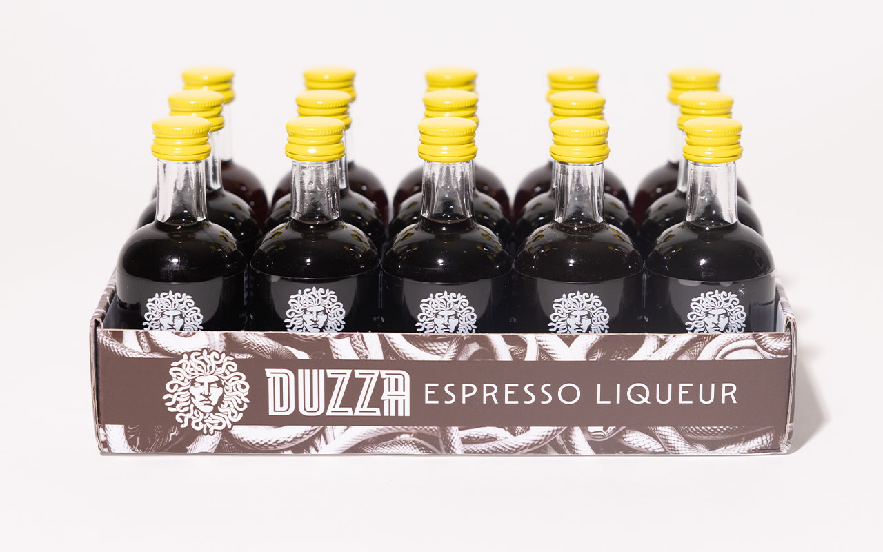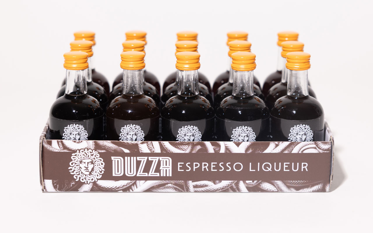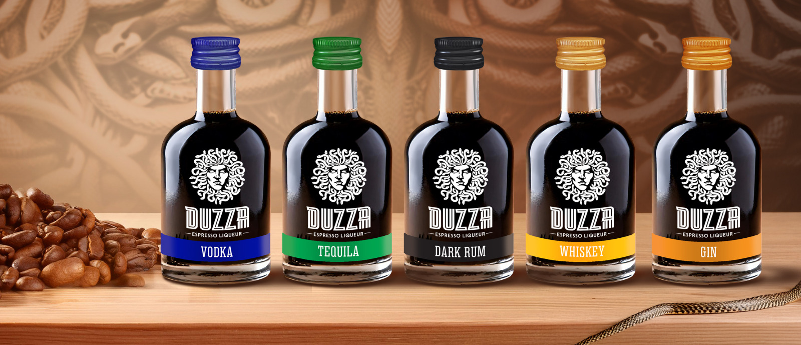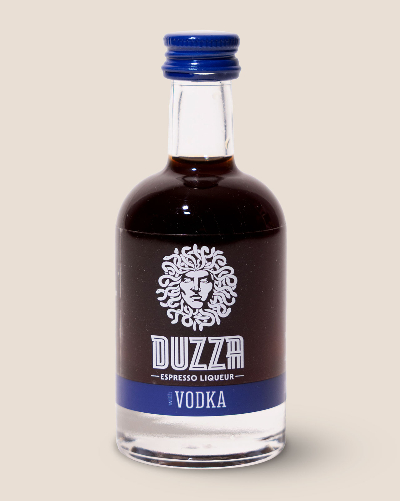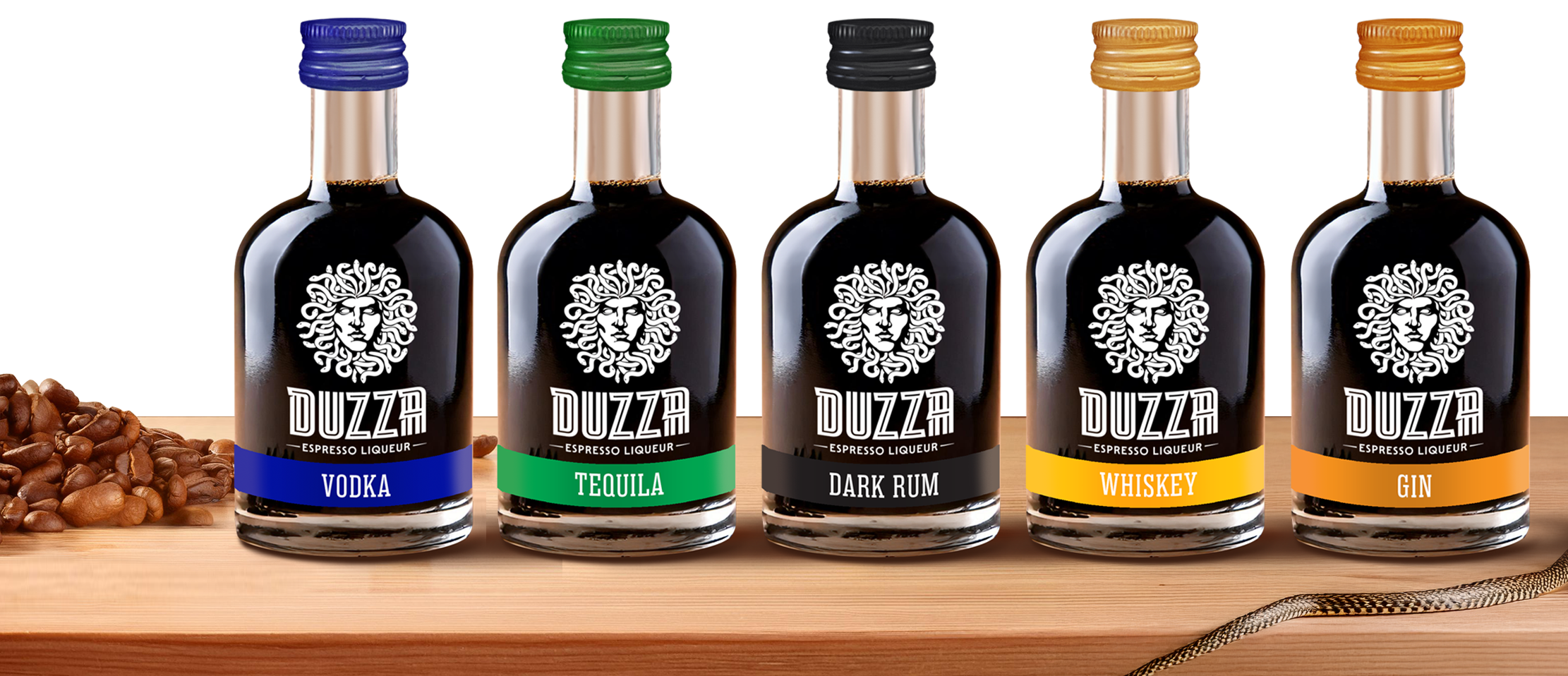 Duzza is a ready to serve cocktail made of espresso mixed with one premium spirit. It’s a 50ml espresso liqueur (20% Alc./Vol.) and comes in five bold flavors: Vodka, Tequila, Dark Rum, Whiskey and Gin.