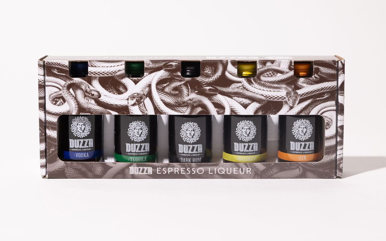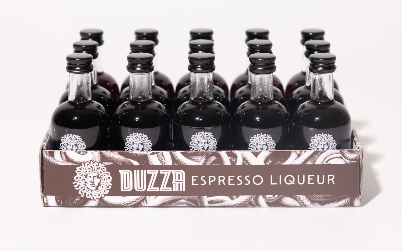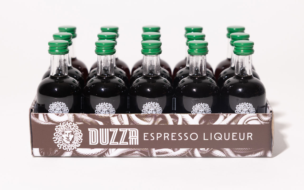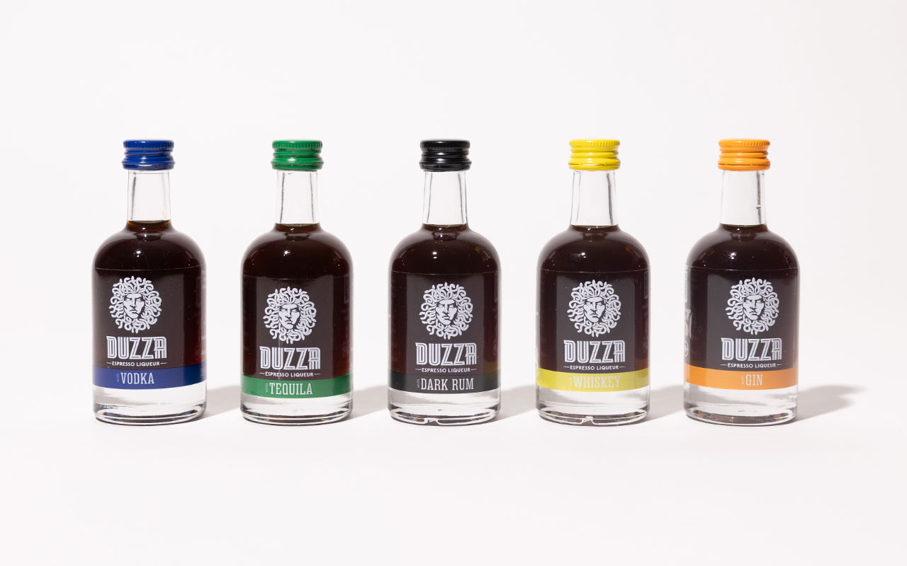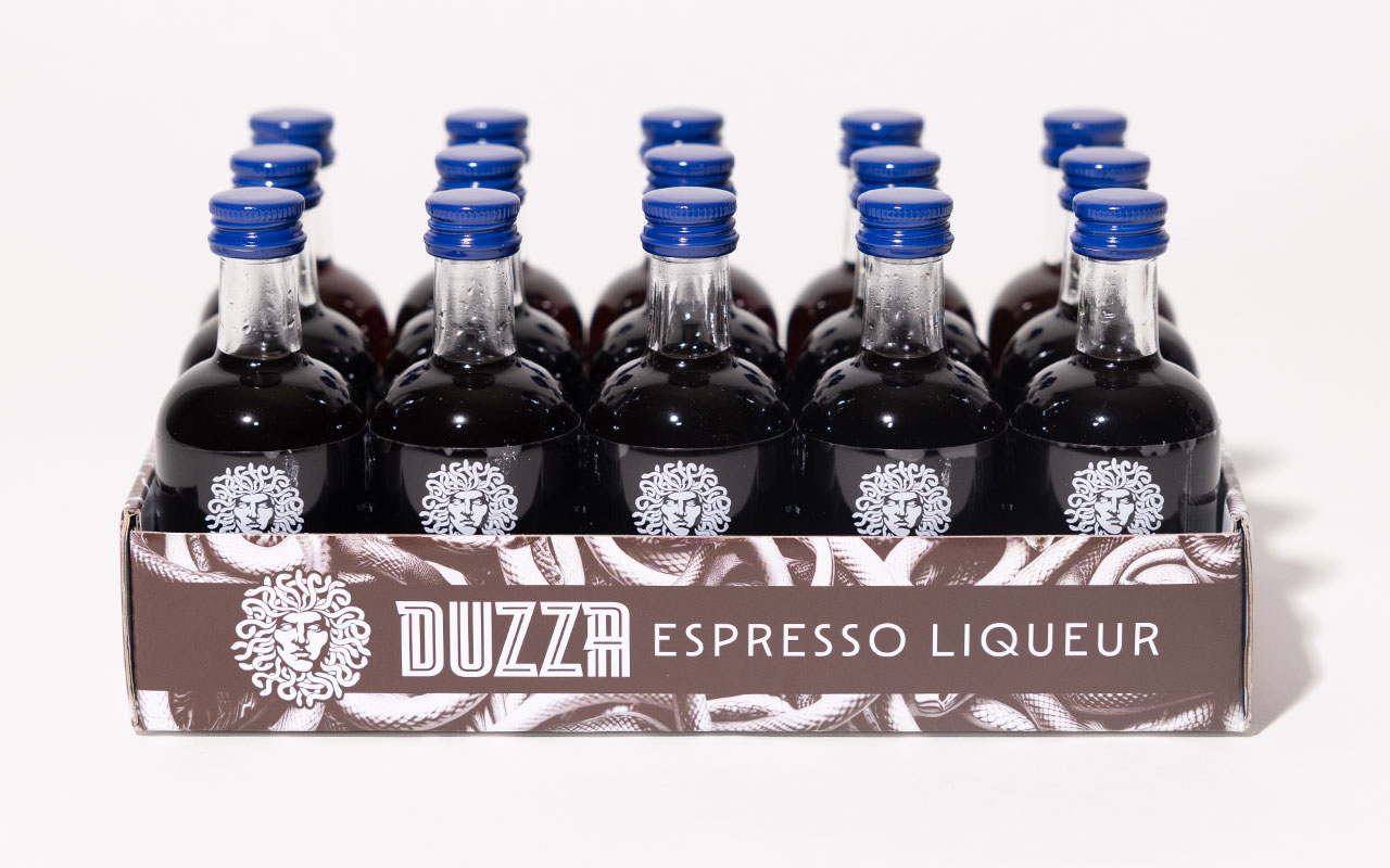 Duzza is a ready to serve cocktail made of espresso mixed with one premium spirit. It’s a 50ml espresso liqueur (20% Alc./Vol.) and comes in five bold flavors: Vodka, Tequila, Dark Rum, Whiskey and Gin.