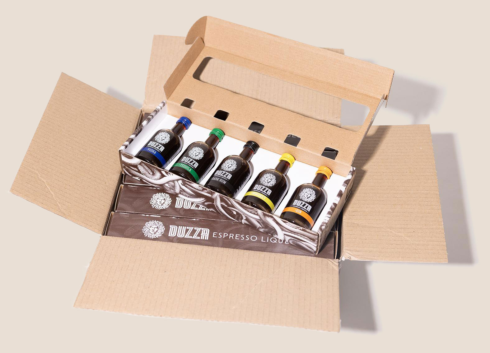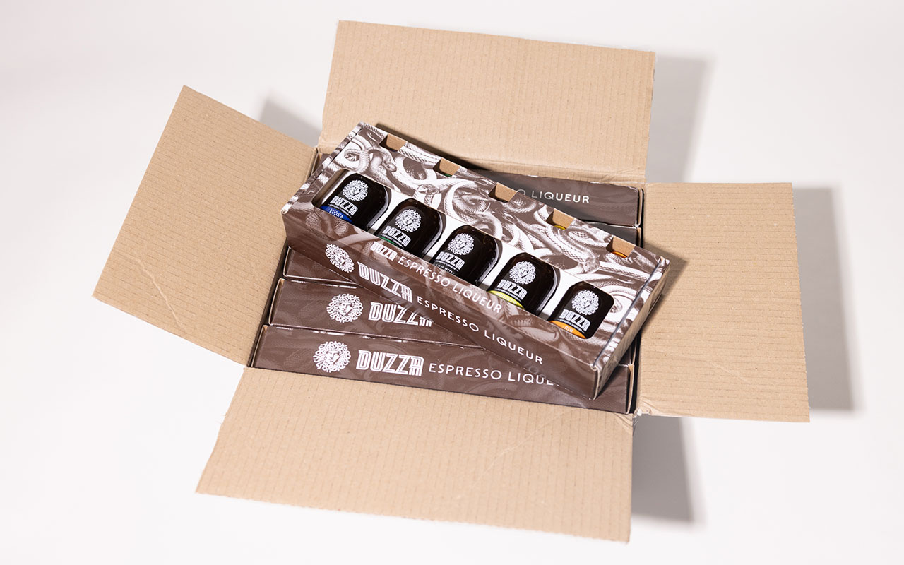 Available in mix pack, the 5 flavors of DUZZA in one beautiful giftbox or horeca tray 15 bottles of one DUZZA flavor.